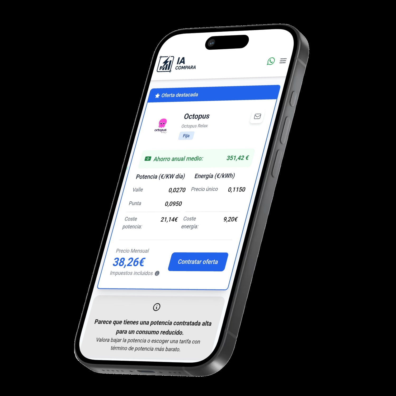A diferencia de otros comparadores de luz, IACompara permite subir la factura en PDF o imagen para analizar consumo real, potencia contratada y precios por tramo horario. Con estos datos, el sistema compara de forma completamente transparente las principales tarifas eléctricas en España y calcula el ahorro potencial personalizado. La plataforma muestra todas las opciones disponibles y, además, no solicita correo electrónico ni teléfono para acceder a los resultados.